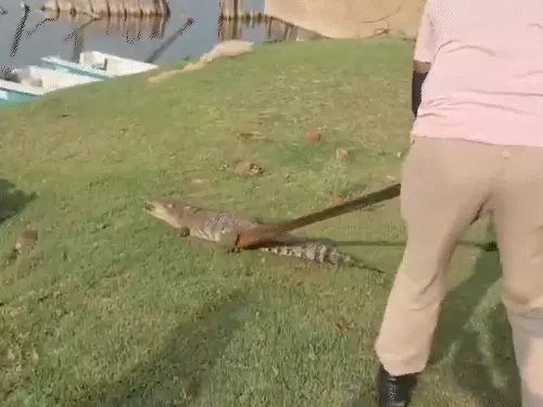 आगरा में चंबल नदी से मगरमच्छ निकलकर गांव में पहुंच गया।