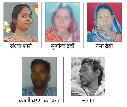 मृतकों की पहचान नेमा देवी (60), बस कंडक्टर कालीचरण (36), सुशीला यादव (55), संध्या देवी के रूप में हुई है। एक की शिनाख्त अभी तक नहीं हो पाई है। नेमा देवी के साथ उनके पति परदेसी गौड़ और उनके दो नाती- अभिनव (7) और नैतिक (14) भी थे। तीनों को हल्की चोट आई है।